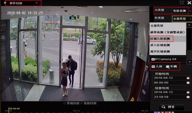 第②步:选择主类型为 “智能侦测”,次类型可选,如区域入侵侦测。选择人或车等类型。