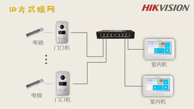 可以看到设备之间只需要通过网线连接至现有局域网内即可,无需复杂走线,IP对讲系统不存在信号传输距离问题,全双工对讲,系统支持标准网络协议,易维护和扩展。