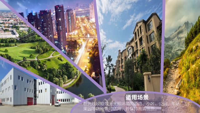 在光线较暗或无光照环境的道路、小区、公园、车站、工厂、果园等场所兼可适用,并保持高清画质。