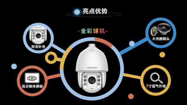 全彩球机:升级大光圈镜头和高灵敏度传感器 ,通过可见光和红外补光相结合的方式,在极低照度下,近距离全彩图像和远距离红外图像都能呈现良好效果。